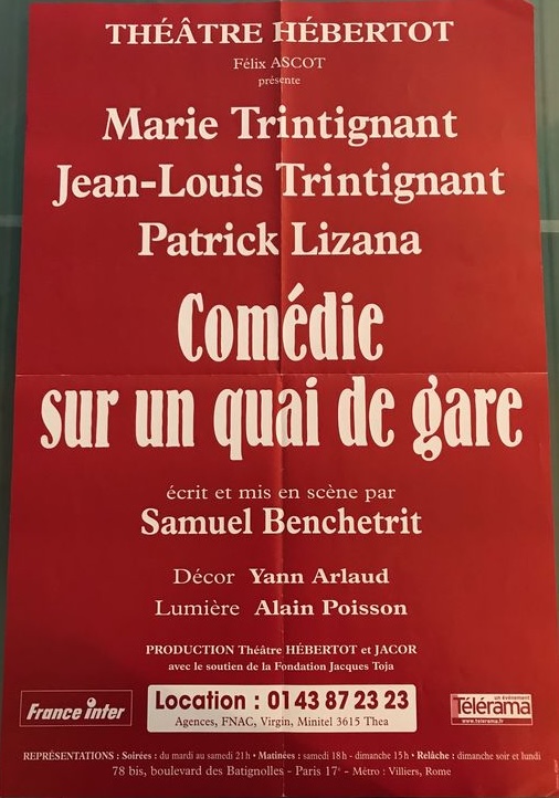 – Comédie sur un quai de gare, 2001, création au Théâtre Hébertot dans une mise en scène de l’auteur et interprétée par Jean-Louis Trintignant,  Marie Trintignant et Patrick Lizana
